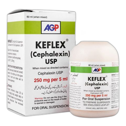 To use AGP Pharma Keflex Oral Suspension, shake the bottle well before each use. Administer the prescribed dosage using the measuring spoon or syringe provided. Ensure that the full course is completed as directed by your healthcare professional, even if symptoms improve before finishing the medication.Adverse Effects