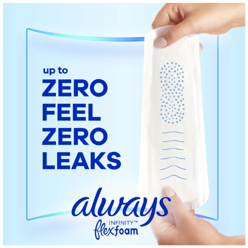 Always Infinity Size 2 Super Pads Non-Wings, Unscented are designed to offer superior protection and comfort during heavier flow days. Made with advanced FlexFoam technology, these ultra-thin and flexible pads move with your body, not against it. The form-fitting grooves and absorbent holes quickly pull fluid away from your skin, giving you dry, breathable, and zero-feel protection. Always Infinity FlexFoam's driest top layer keeps you feeling fresh and confident throughout the day. Dermatologically tested and ideal for heavy flow, these pads help you stay focused on your day, not your period.