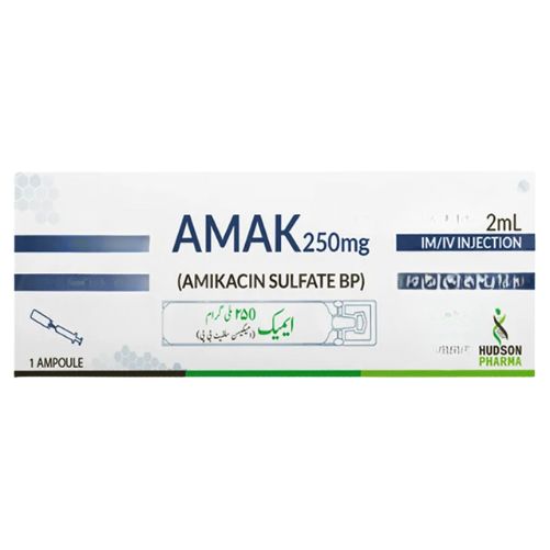 Amak 250mg/2ml injection is a powerful antibiotic containing Amikacin Sulfate, a member of the aminoglycoside class of antibiotics. It is designed to treat serious infections caused by amikacin-sensitive gram-negative bacteria, including staphylococcus infections. This injection is typically administered in a hospital setting by a medical professional and is used for conditions such as meningitis, urinary tract infections, and other severe bacterial infections. The high potency of this medication makes it essential for managing life-threatening infections when other treatments may not be effective.