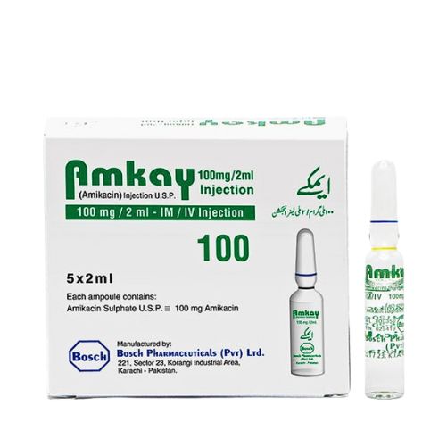Amkay 100mg Injection is a powerful antibiotic used to treat serious bacterial infections caused by gram-negative organisms. Containing Amikacin 100mg, this medication belongs to the aminoglycoside class of antibiotics, known for its ability to effectively target and eliminate harmful bacteria. Amkay is typically used in hospital settings for the treatment of severe infections, including hospital-acquired pneumonia and other infections that may be resistant to other types of antibiotics. Administered through injection, it offers rapid relief from infections that can otherwise be difficult to treat.