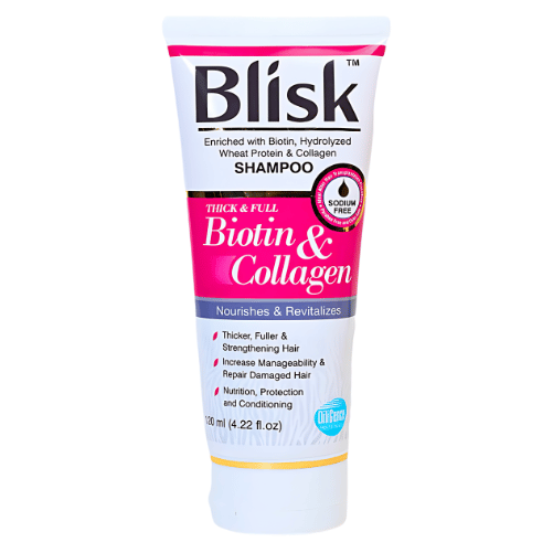 Blisk Biotin Collagen Shampoo is a revitalizing hair care formula enriched with Biotin (Vitamin B7), Hydrolyzed Wheat Protein, Dexpanthenol (Vitamin B5), and Collagen to nourish, repair, and volumize dry, thinning, or brittle hair. This shampoo deeply penetrates the hair shaft to boost strength, restore manageability, and promote fuller, shinier strands. Ideal for all hair types, including color-treated, aging, or post-transplant hair, Blisk is sodium-free, paraben-free, and color-safe, offering gentle cleansing without compromising hair health.