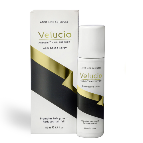 Velucio AnaGain Hair Support is a foam spray that helps reduce hair fall and promotes natural hair growth. It contains AnaGain™, an active ingredient from organic pea sprouts, which stimulates hair follicles for thicker, healthier hair. This formula also improves hair shine and softness.